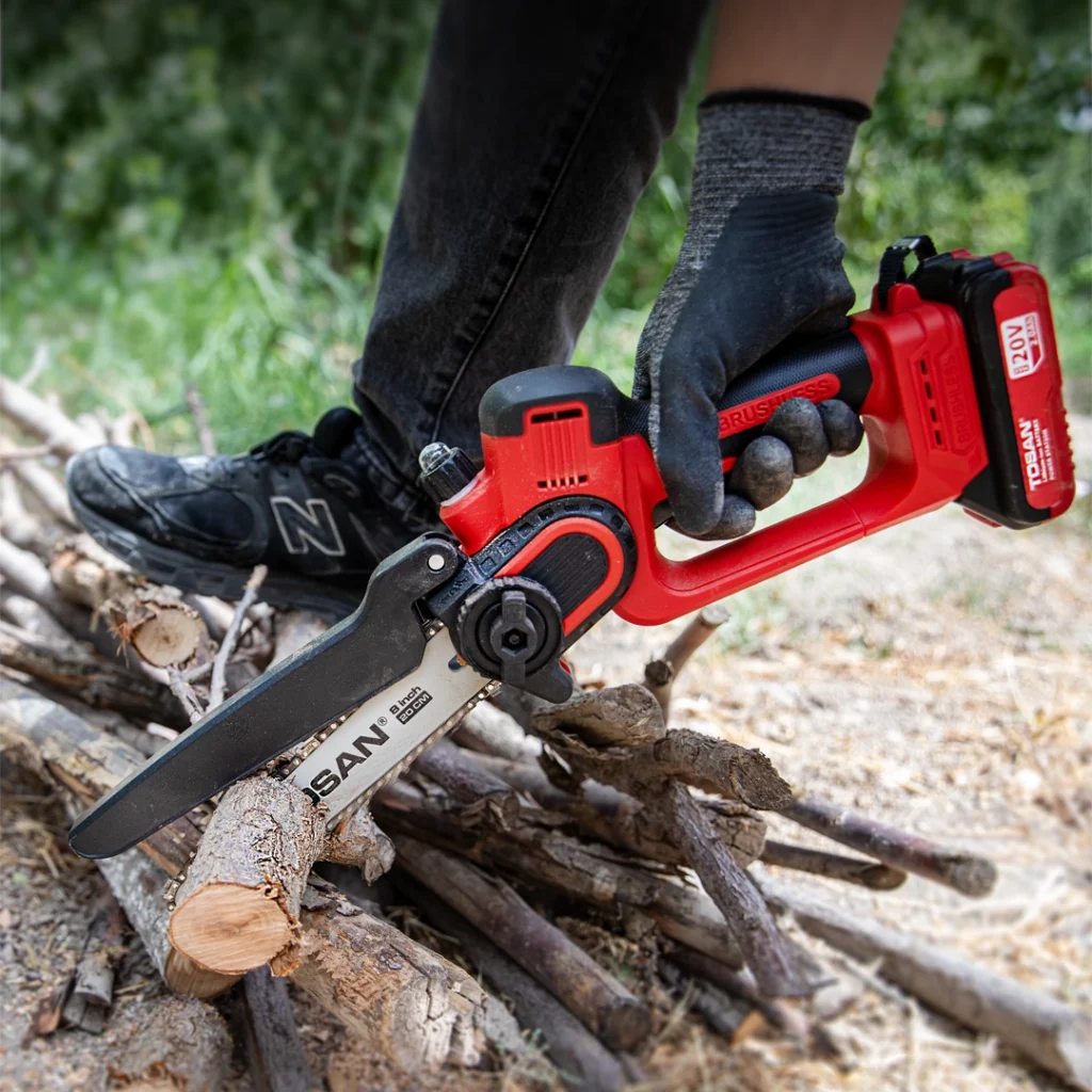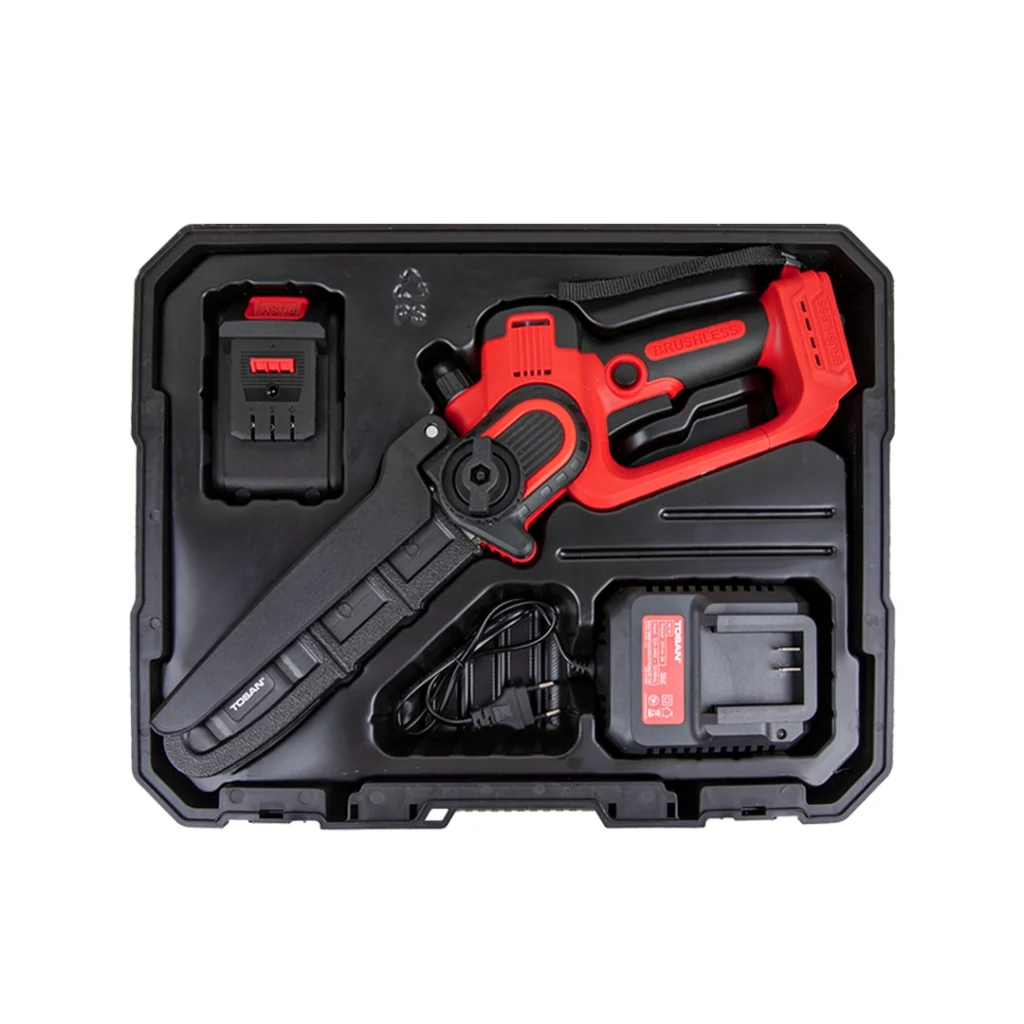 برند تیغه این مدل از اره باغبانی توسن Oregon آمریکاست که بسیار مقاوم و ضد زنگ میباشد. از ویژگیهای این ابزار میتوان به قابلیت برش چوب تر و خشک، باطری کشویی، قابلیت تعویض تیغه و سیستم محافظ اضافه بار اشاره کرد. همچنین به منظور جلوگیری از روشن شدن ناگهانی محصول، شاسی ایمنی سوییچ بر روی آن تعبیه شده است. در آخر بهتر است به یاد داشته باشیم موتورهای براشلسی که در ابزارهای شارژی به کار گرفته میشود، مزایای قابل توجهی نسبت به موتورهای سنتی دارند؛ طول عمر بیشتر، مصرف انرژی کمتر و قدرت خروجی بالاتر از جمله این مزایا هستند که قابل توجه است.