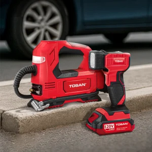 کیت کمپرسور فندکی شارژی و چراغ قوه شارژی 20 ولت توسن، مدل 9799K کیف برزنتی، ترکیبی کاربردی از دو ابزار ضروری برای سفر و استفاده در شرایط مختلف است. این مجموعه شامل یک کمپرسور فندکی شارژی با قابلیت پمپاژ تایر خودروها و ابزارهای مشابه، به همراه یک چراغ قوه شارژی 20 ولت است که نور کافی را برای کار در شب یا شرایط کمنور فراهم میآورد.